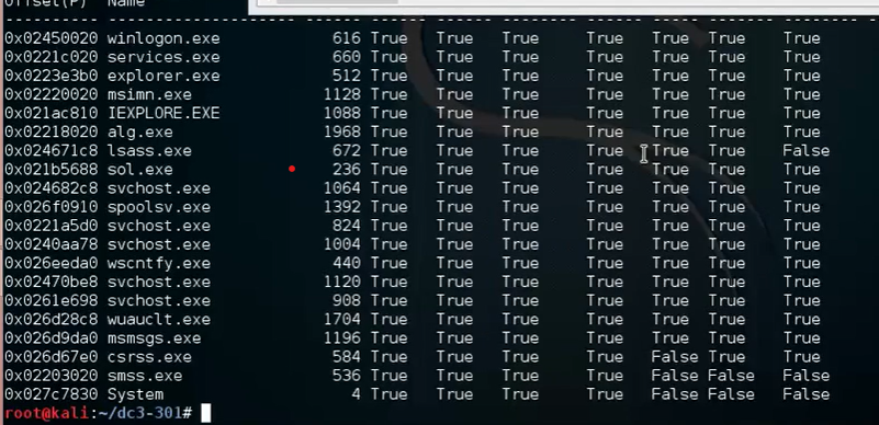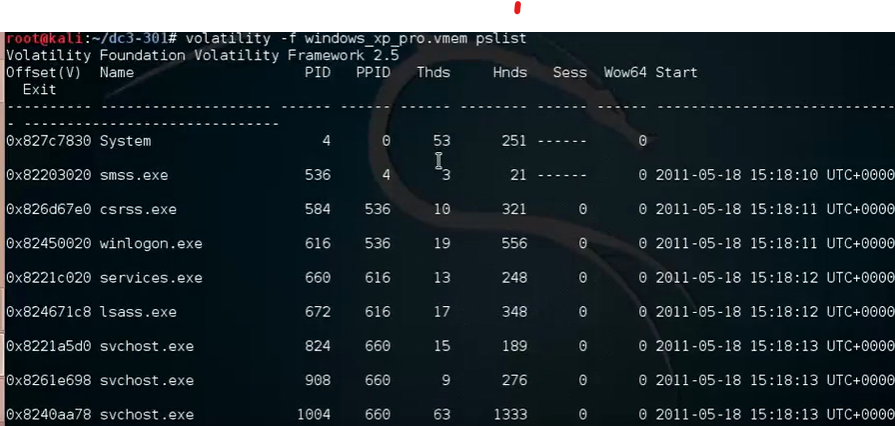 pslist,psscan으로 검색하여 아래 질문 검색가능 (+강의에선 psㅌview,pstree까지 검색해봄)