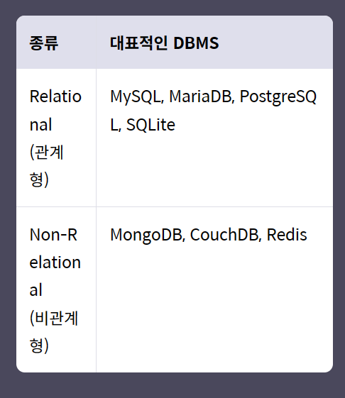 관계형은 행과 열의 집합인 테이블 형식으로 데이터를 저장/ 비관계형은 테이블 형식이 아닌 키-값 (Key-Value) 형태로 값을 저장